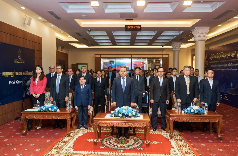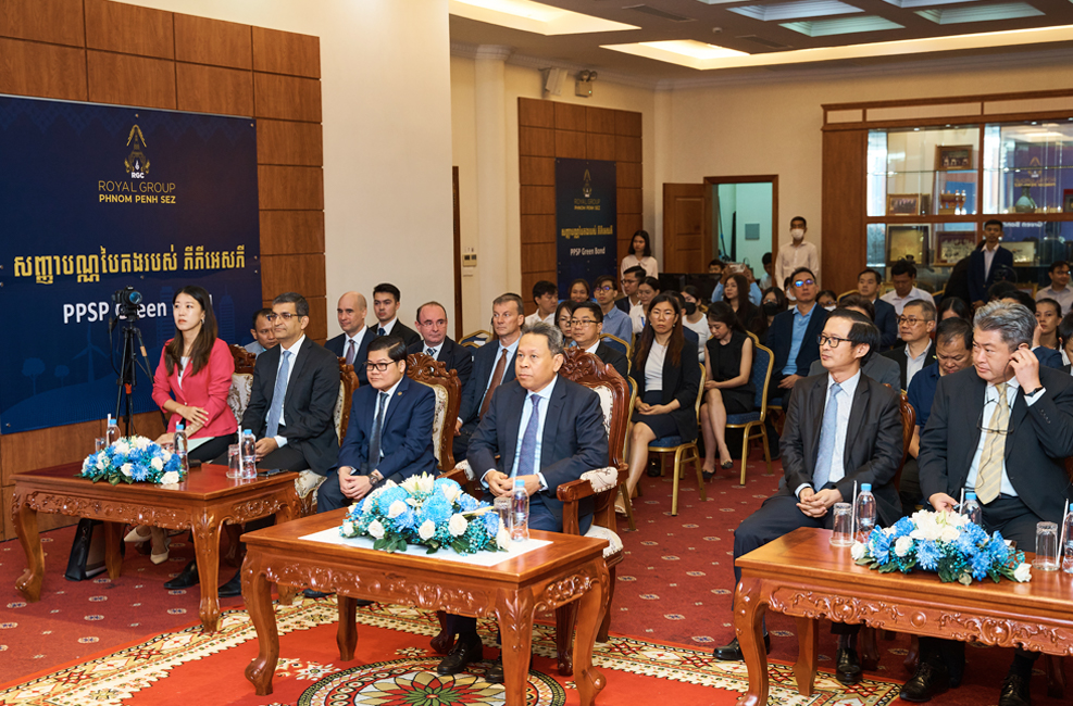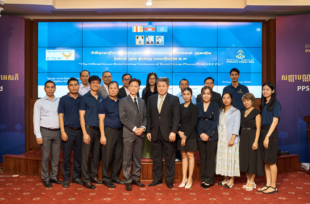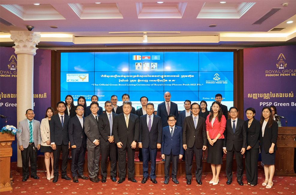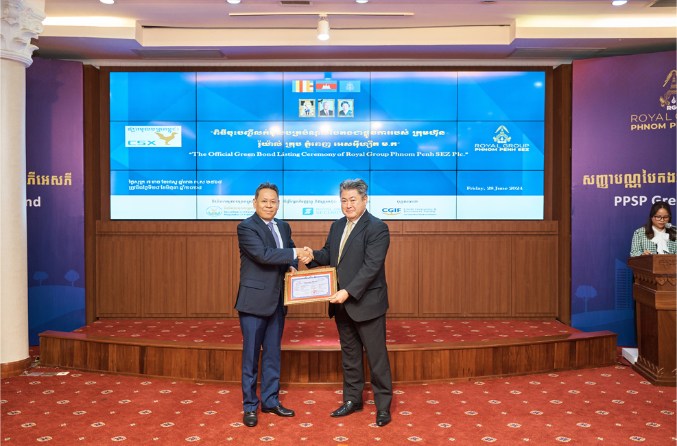 On 28 June 2024 – In a significant step forward for green finance in Cambodia, Royal Group Phnom Penh SEZ (RGPPSEZ) announced the issuance of KHR 41 billion green bond at the Cambodia Securities Exchange. The event was presided over by H.E. Dr. HEAN Sahib, Secretary of State of the Ministry of Economy and Finance and Chairman of the Cambodia Securities Exchange, H.E. Sou Socheat, Delegate of Royal Government in charge as Director General of Securities and Exchange Regulator of Cambodia, H.E. Hong Sok Hour, Delegate of the Royal Government in charge as CEO of the CSX, Mr. UEMATSU Hiroshi, CEO of Royal Group Phnom Penh SEZ Plc. (PPSP), Mr. Anuj Awasthi, Vice President Operations of Credit Guarantee & Investment Facility, Ms. Shomi Kim, Country Representative of the Global Green Growth Institute (GGGI) and representative of the consortium of the Cambodia Sustainability Bond Accelerator (CSBA) program with the distinguish guests.