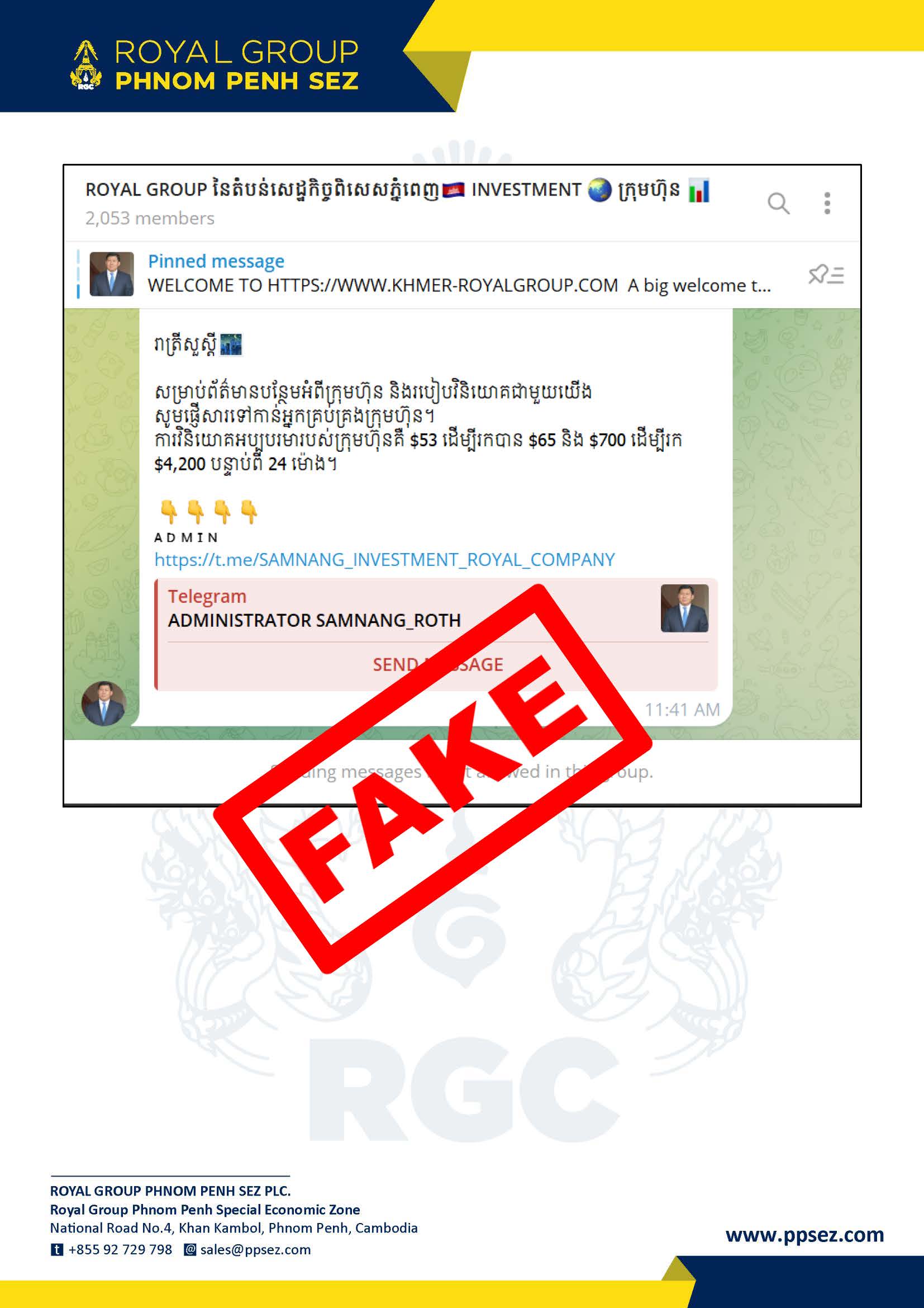 Name of FAKE Telegram Group:​  ROYAL GROUP នៃតំបន់សេដ្ឋកិច្ចពិសេសភ្នំពេញ