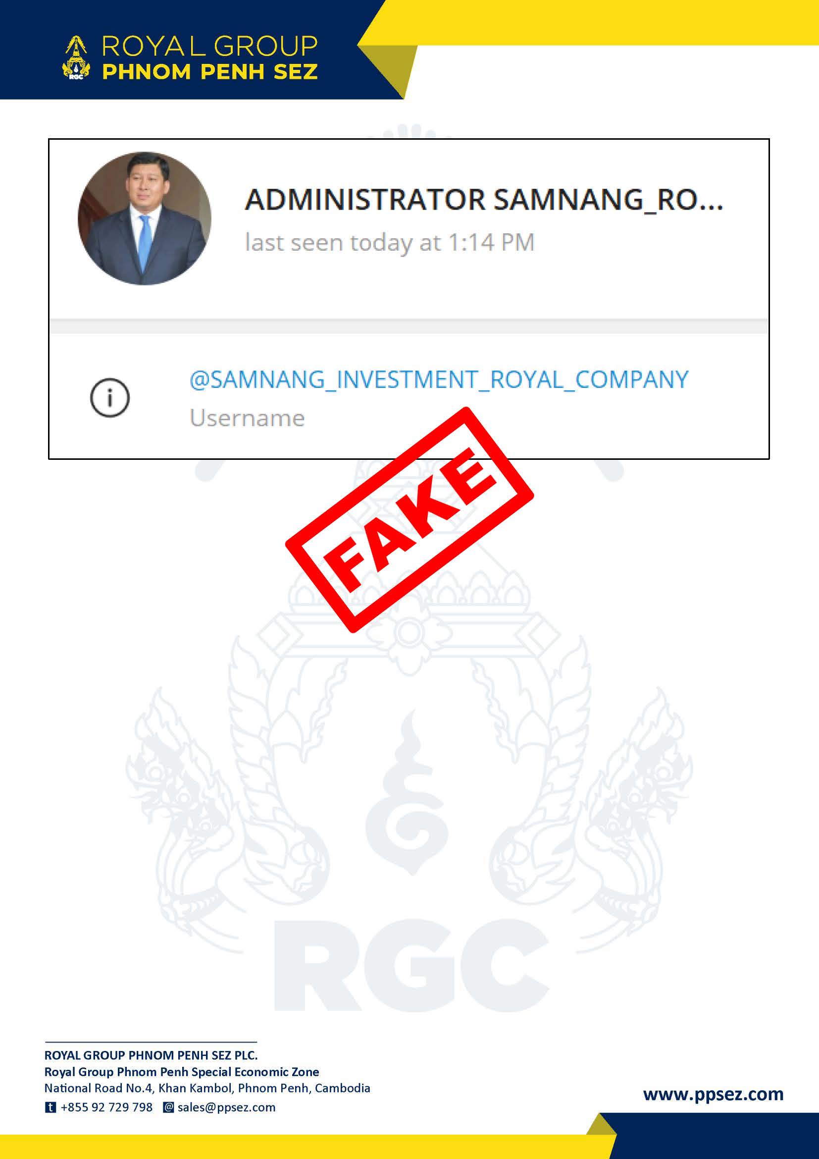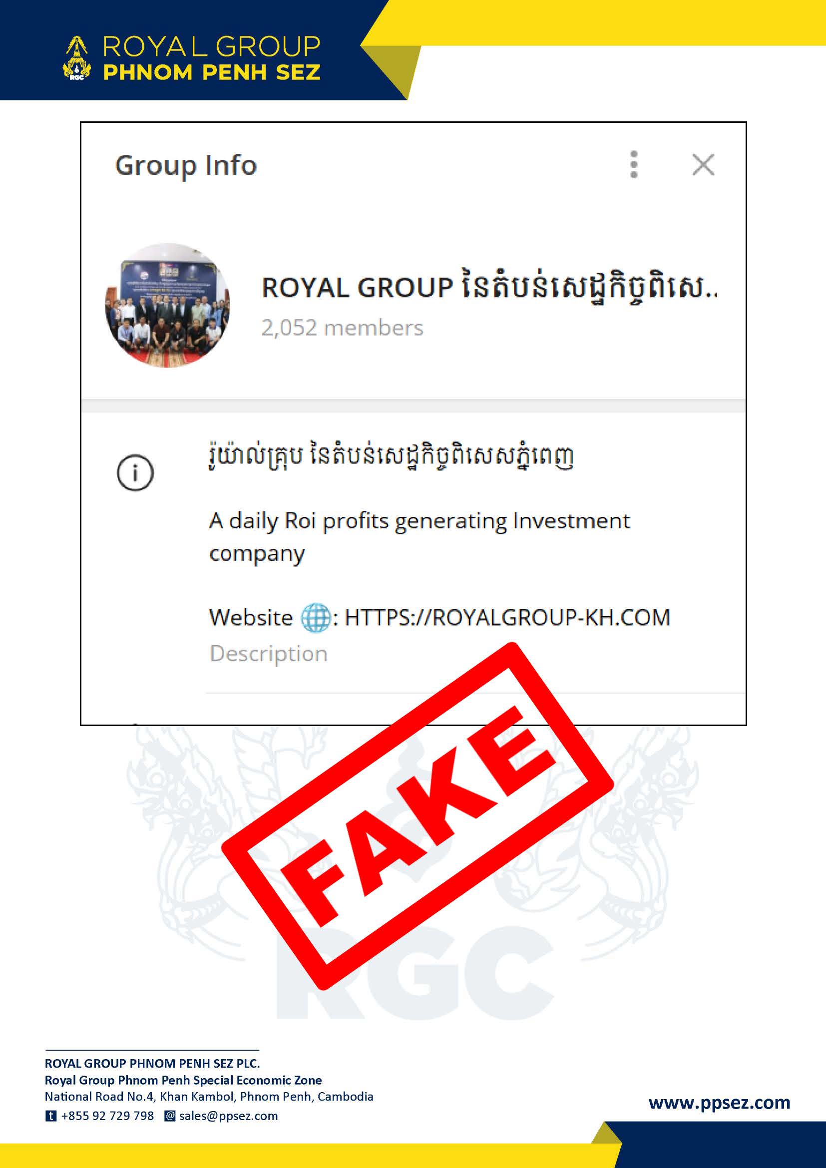 We, management of Royal Group Phnom Penh SEZ Plc., the developer of Royal Group Phnom Penh Special Economic Zone, would like to announce to the general public that recently there has been a FAKE Telegram Group created by using our company name and logo without our permission and knowledge. We declare that this FAKE Telegram Group has nothing to do with our company, and we take NO responsibility for any loss or damage caused by their illegal activities. We are now taking legal actions to eliminate this illegal group. Meanwhile, please the general public beware and cautious not to fall into any cheating that the group owner has planned. And please help inform to your family and friends that this is a FAKE group, and stop following or sharing this group.