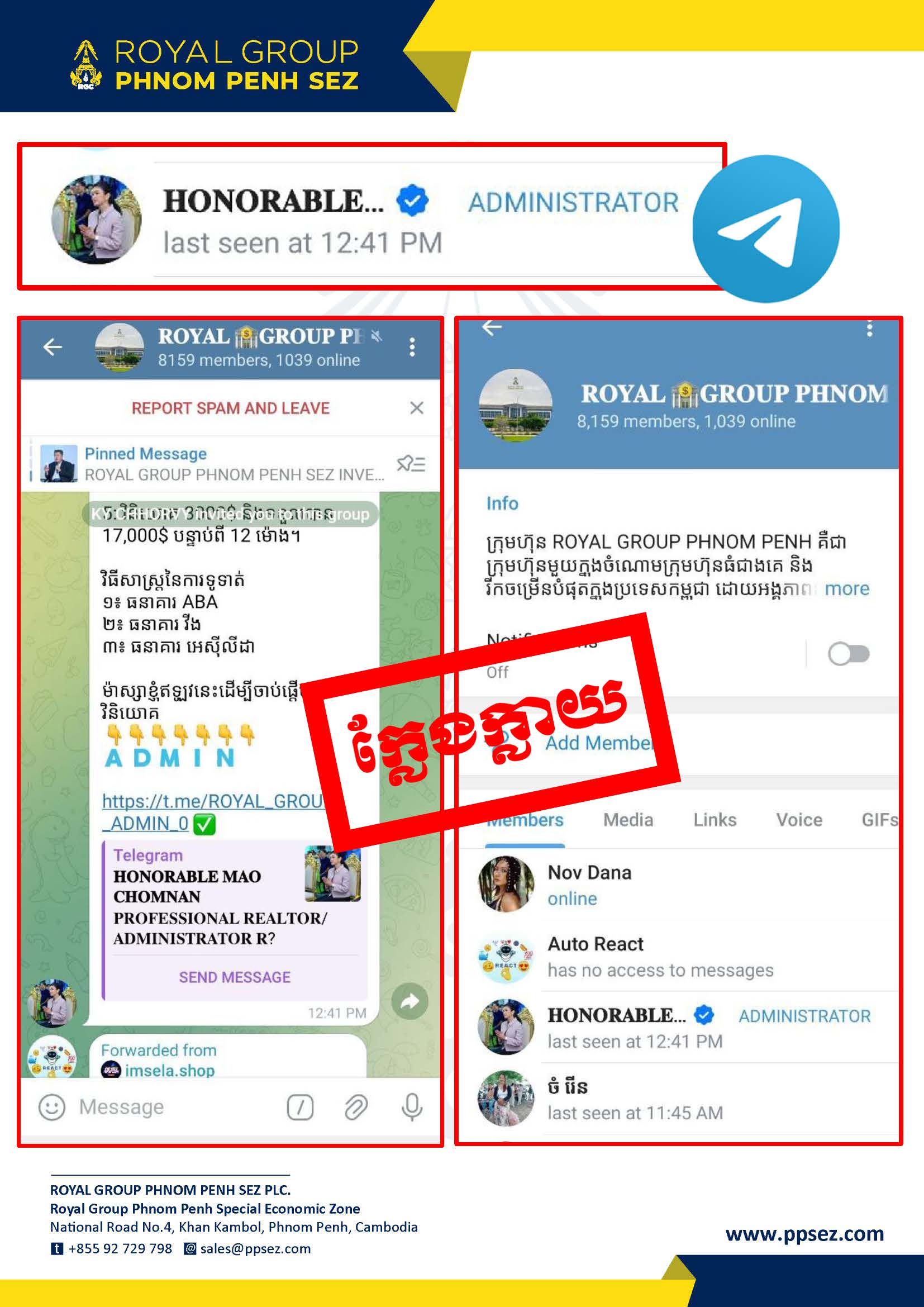 • Fake Telegram Channel Name: ROYAL GROUP PHNOM PENH SEZ