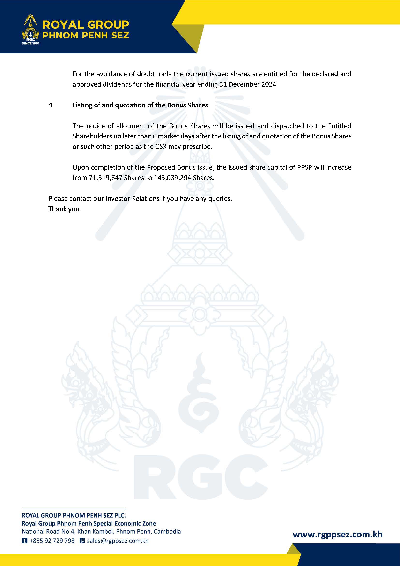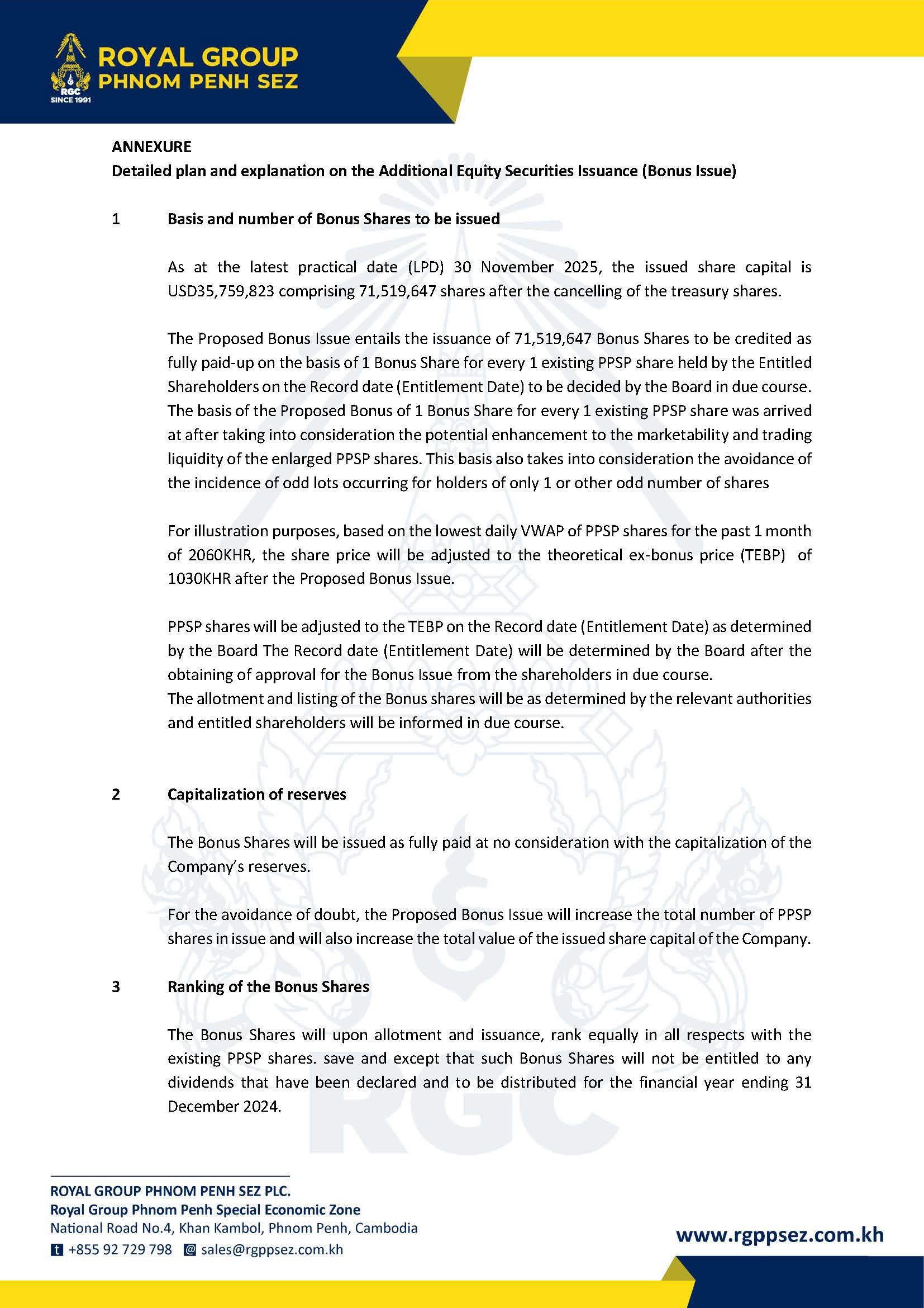 A Dividend Distribution amounting to USD1,357,214 equivalent to approximately 76.06KHR per share was approved by the shareholders for distribution with the Record date 23 December 2025.