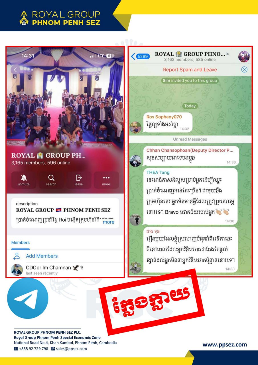 The management team of Royal Group Phnom Penh SEZ Plc., developer of the Royal Group Phnom Penh Special Economic Zone, wishes to inform the public that an unauthorized and FAKE Telegram Channel has been created using our Compnay’s name without our knowledge and permission. This fraudulent Telegram Chennel is in no way affiliated with our company, and we assume NO responsibility for any loss or damage resulting from any interactions with it.