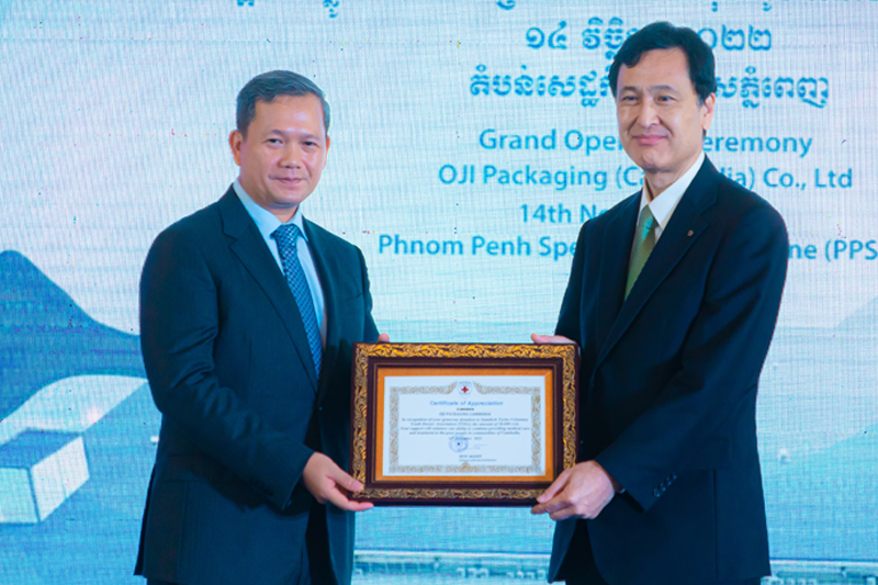 フン・セン首相の先見性のあるリーダーシップの下、カンボジア政府が新型コロナ感染拡大抑制のための管理と予防接種を効果的に行ったことにより、今日のこのグランドオープニング式典に立ち会うことができました。OJI Packaging (Cambodia) Co., Ltd.の末永いご繁栄とご発展をお祈り申し上げます。